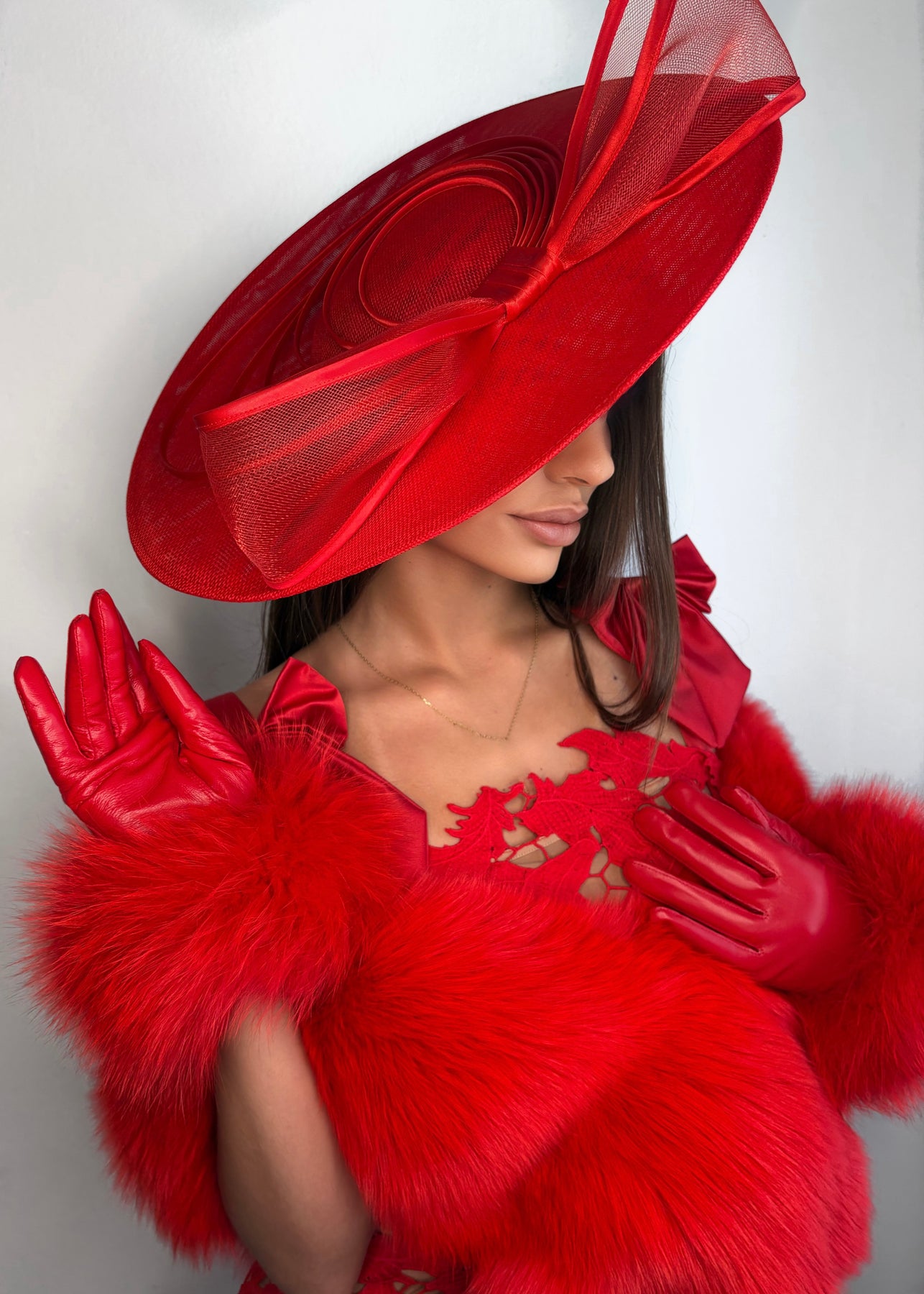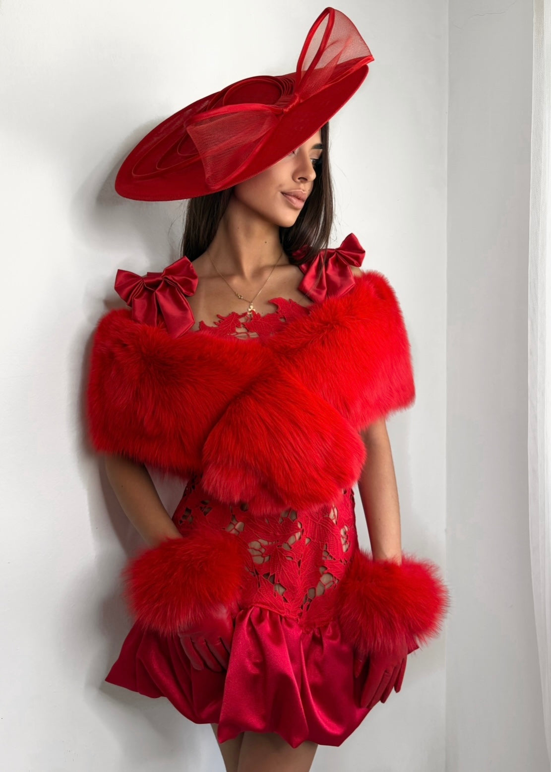 Dyed in scarlet red and crafted from ethically sourced pelts, it stands out for its exceptional softness. It adds texture and distinction to any outfit.
